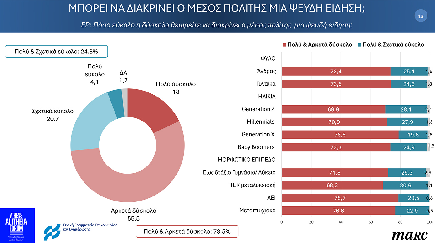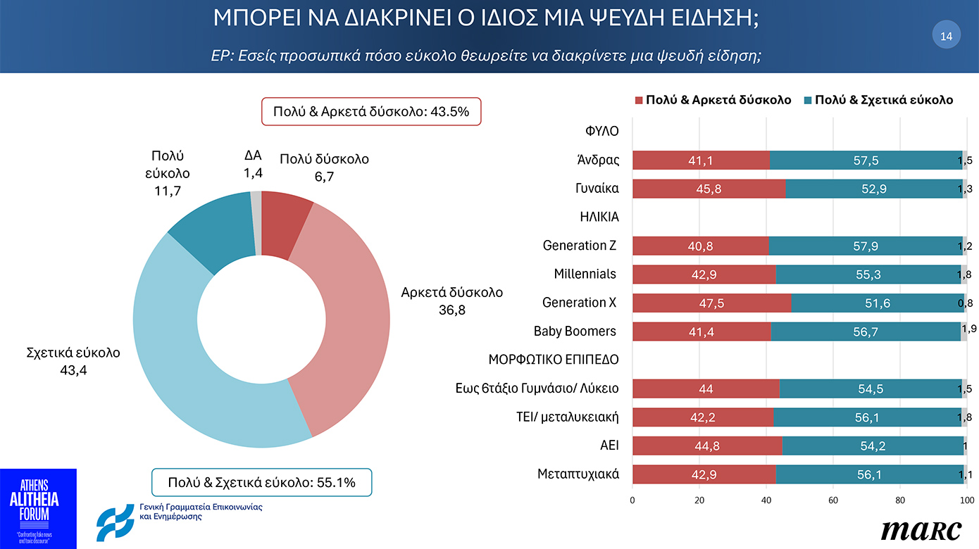Επιπλέον, όταν ρωτήθηκαν αν οι ίδιοι μπορούν εύκολα να διακρίνουν μια ψευδή είδηση, σχεδόν οι μισοί (55,1%) λένε ότι θα μπορούσαν να το κάνουν πολύ ή σχετικά εύκολα.