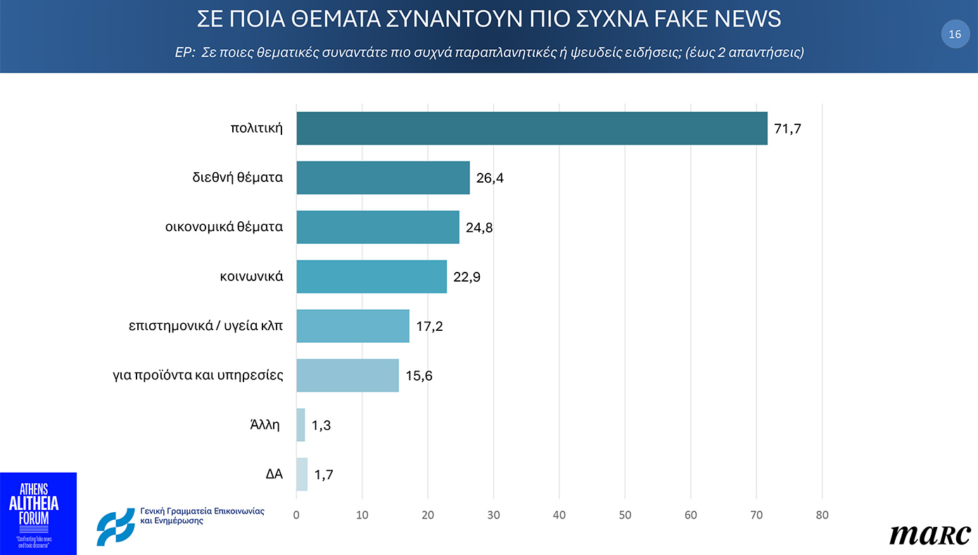 Από τα fake news που συναντούν το 77,1% αφορά την πολιτική, ενώ αμέσως μετά ακολουθούν τα διεθνή θέματα με 26,4% και τα οικονομικά με 24,8%.