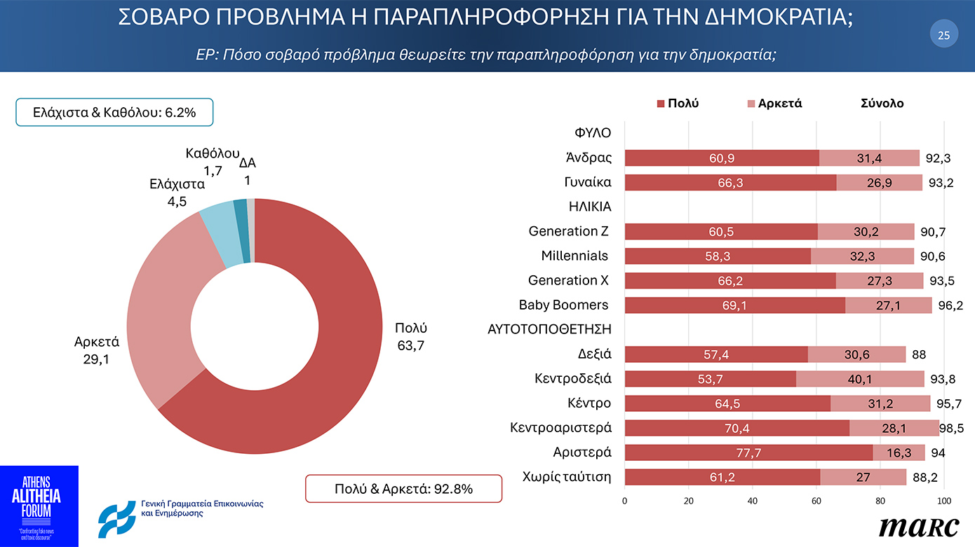 Ενώ, θεωρούν τα fake news πρόβλημα για τη δημοκρατία κατά 92,8% και τα θεωρούν επικίνδυνα για την εθνική ασφάλεια το 75,9%.