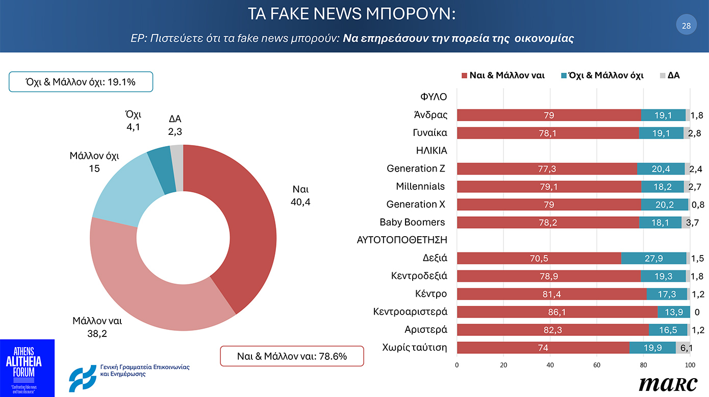 Συντριπτικές, μάλιστα, είναι οι απόψεις των ερωτηθέντων για το αν τα fake news μπορούν να επηρεάσουν την πορεία της οικονομίας: Ναι και μάλλον ναι: 78,6%, να αλλοιώσουν τα αποτελέσματα των εθνικών εκλογών: ναι και μάλλον ναι: 81,8%, να επηρεάσουν τις ζωές των πολιτών: ναι και μάλλον ναι 88,1%.