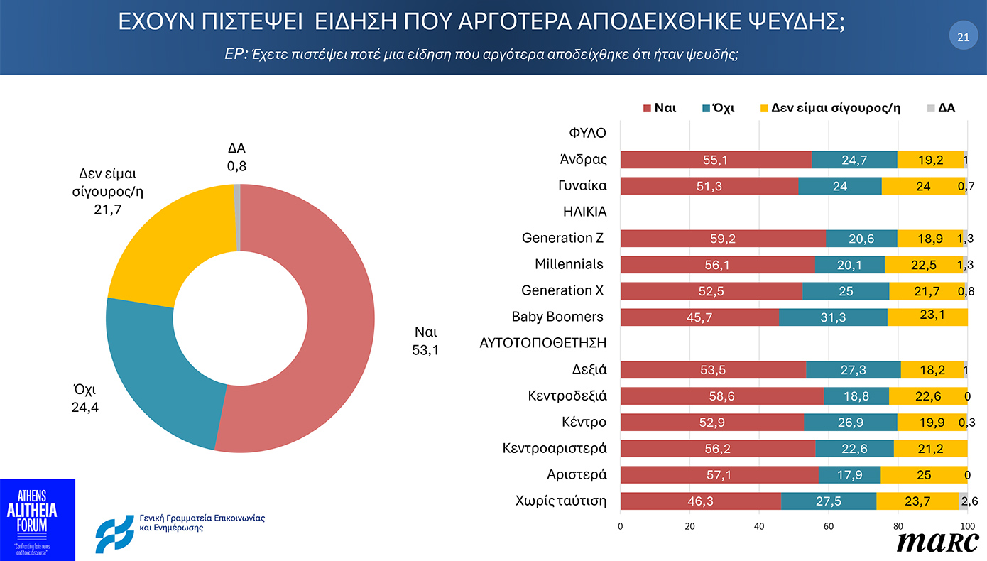 Περισσότεροι από τους μισούς Έλληνες και συγκεκριμένα το 53.1% έχουν πιστέψει είδηση που αργότερα αποδείχτηκε ψευδής, σύμφωνα με την έρευνα «Αναζητώντας την αλήθεια: Τι πιστεύουν οι Έλληνες για τα fake news», της εταιρείας Marc που παρουσιάστηκε στο Athens Alitheia Forum, της Γενικής Γραμματείας Επικοινωνίας και Ενημέρωσης.