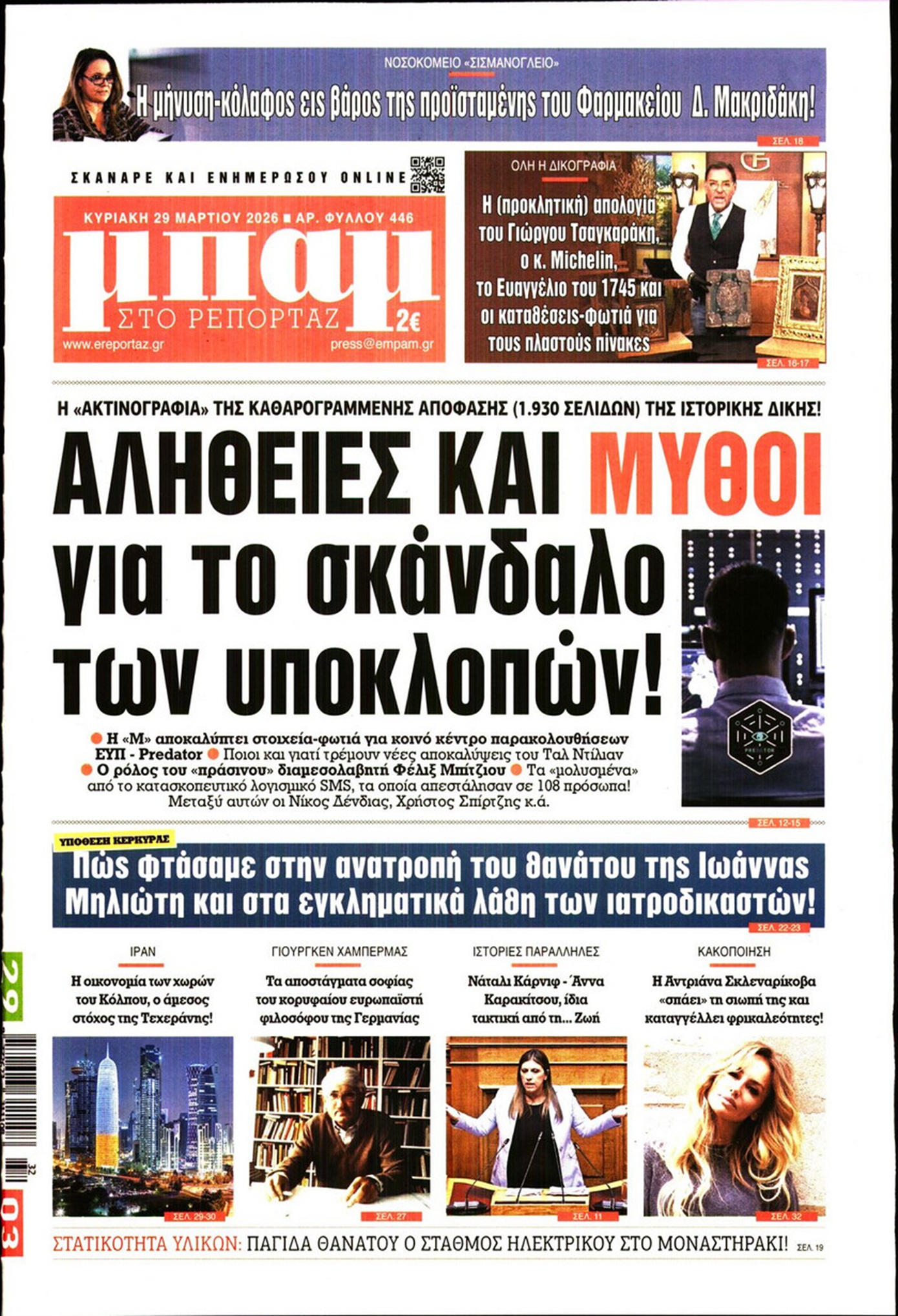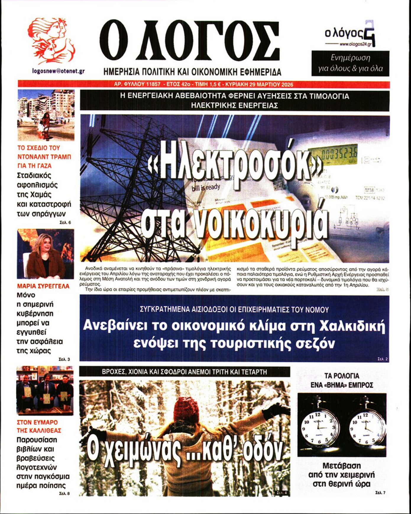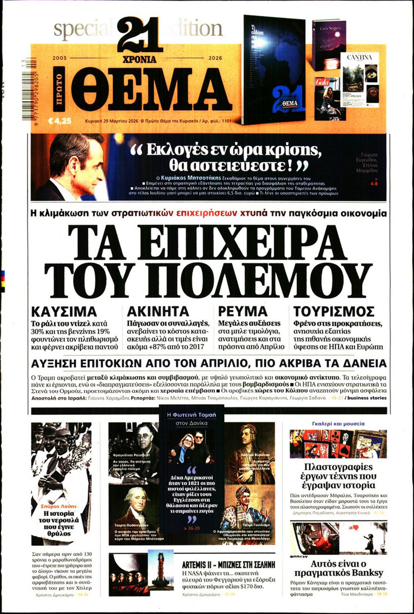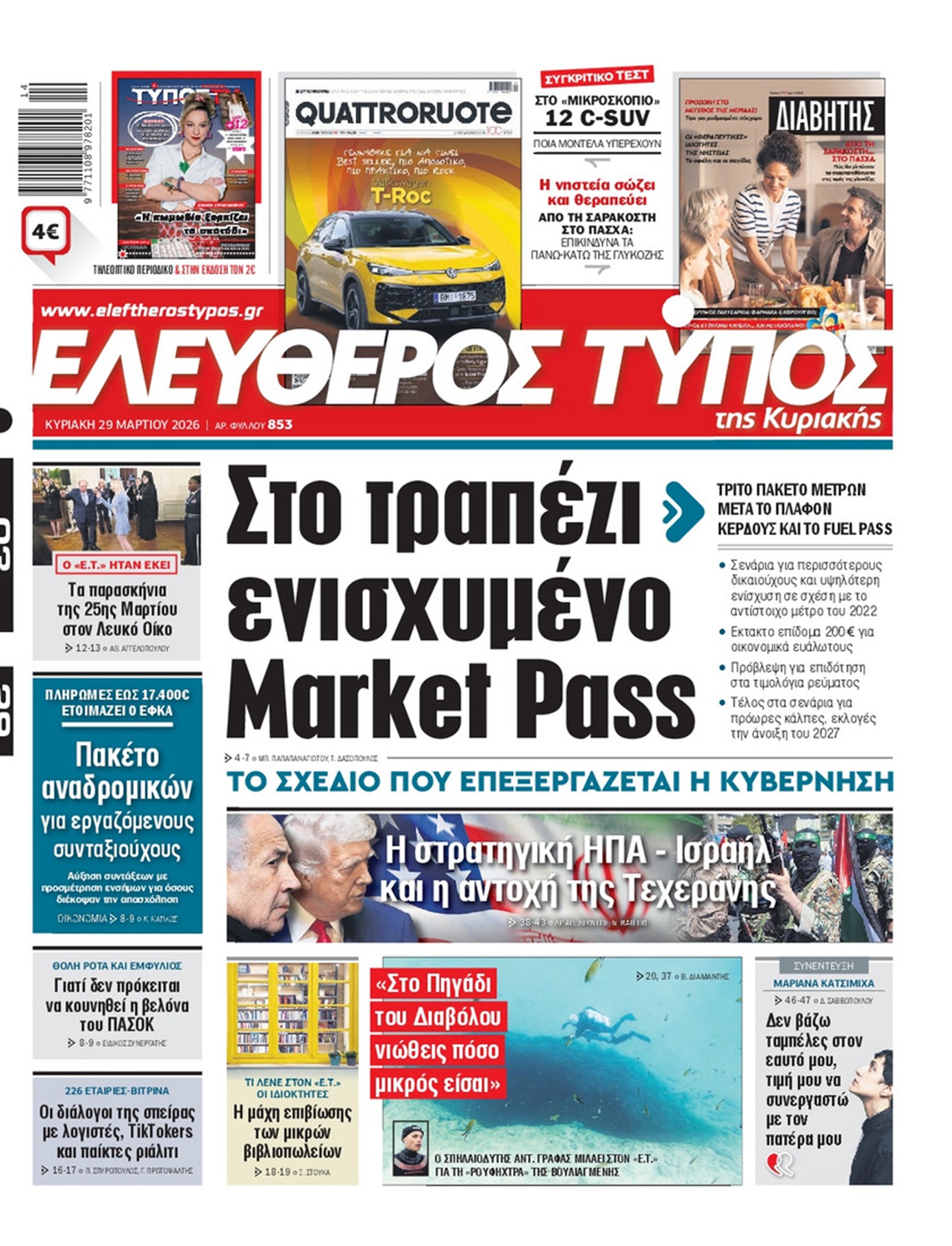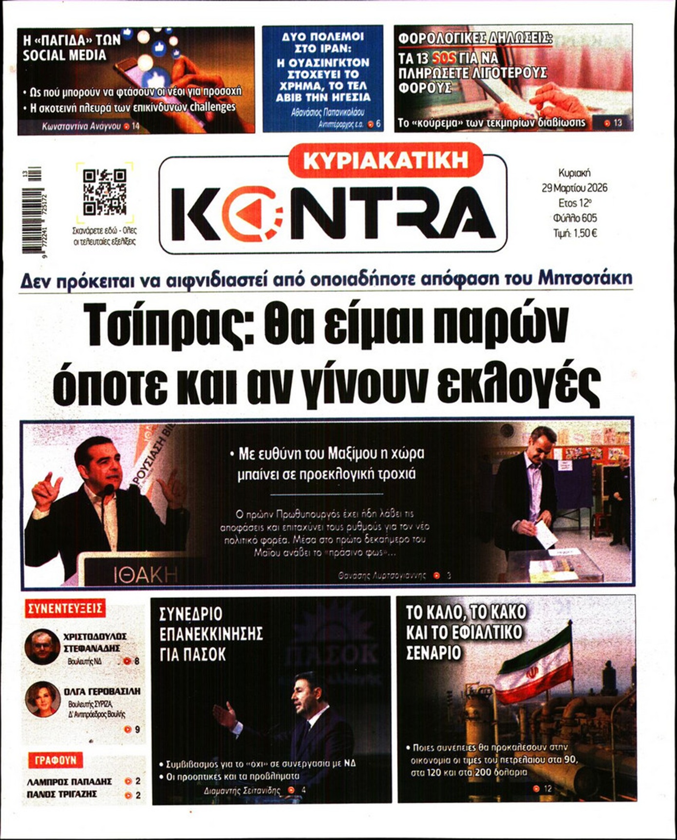 Τα εκλογικά σενάρια για κάλπες εντός του 2026, το τραπέζι σχέδιο για market pass, τα επίχειρα του πολέμου και πότε «βλέπουν» το τέλος του πολέμου κυριαρχούν στα πρωτοσέλιδα των κυριακάτικων εφημερίδων.