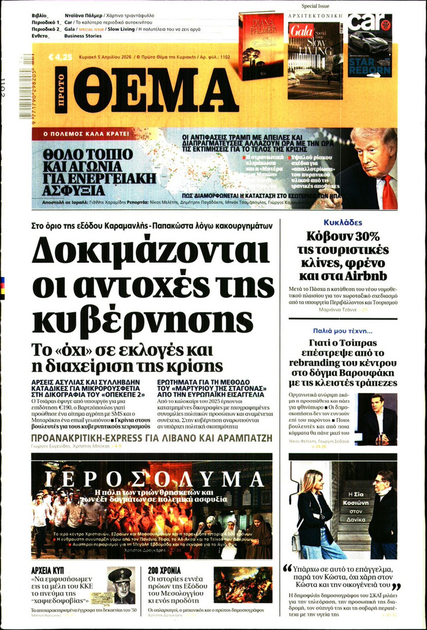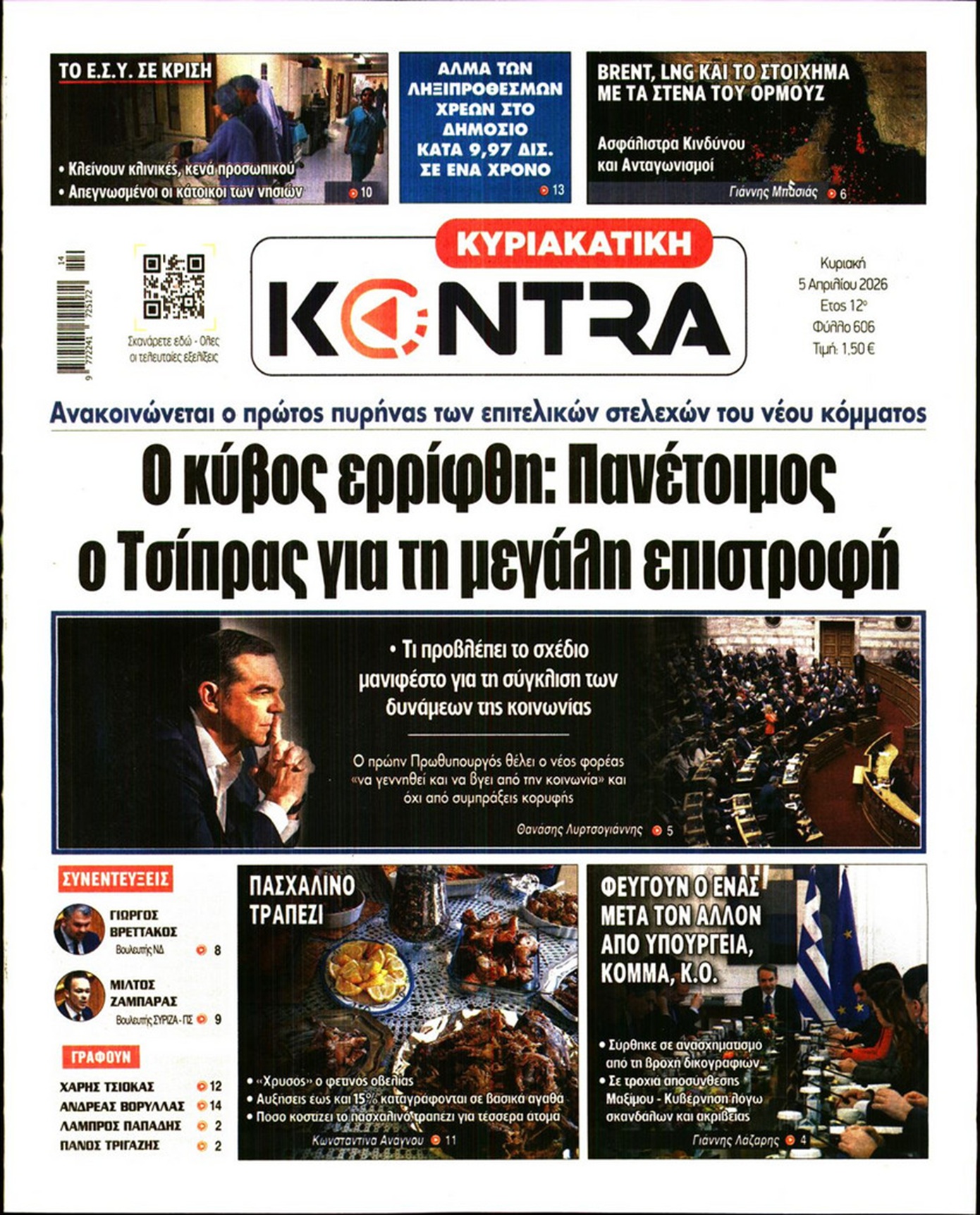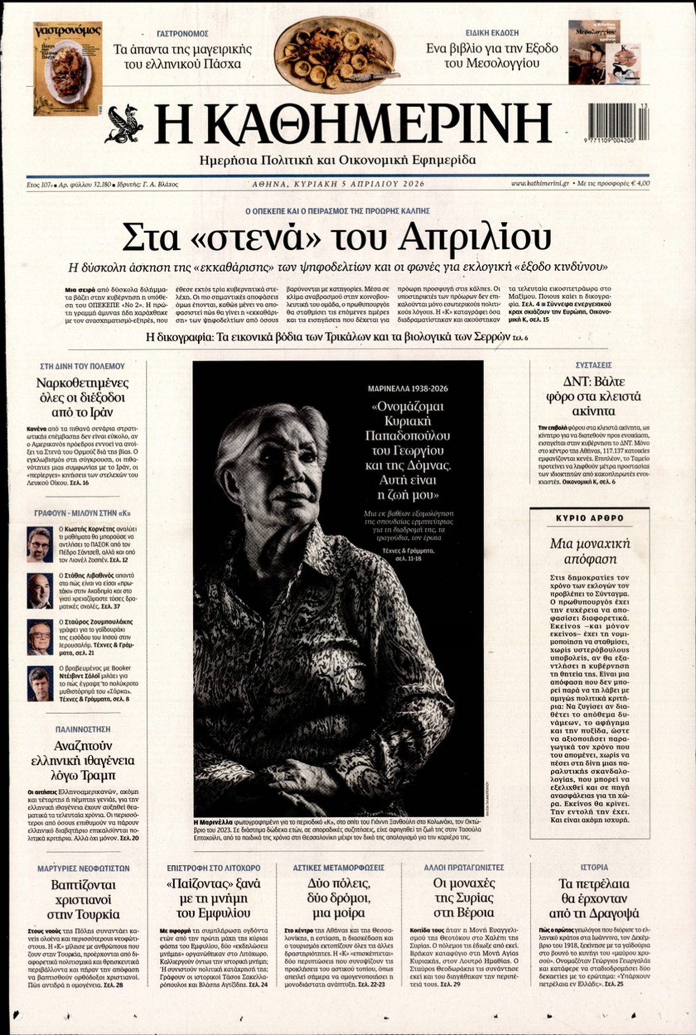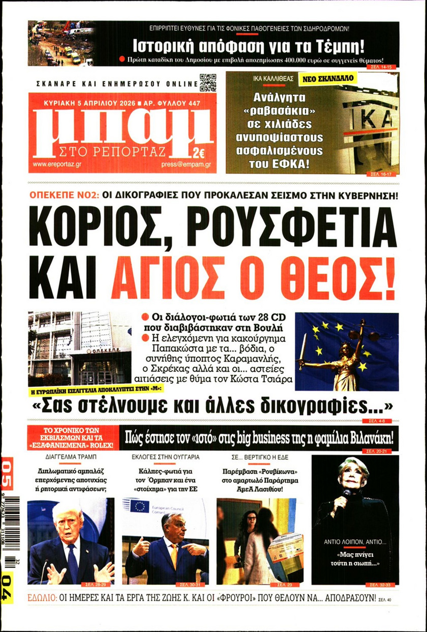 Τα όσα φέρνει ο Απρίλιος μετά τις νέες δικογραφίες για τον ΟΠΕΚΕΠΕ, η αντεπίθεση του Κυριάκου Μητσοτάκη με κάλπες το 2027, οι αντοχές της κυβέρνησης, αλλά και το δύσκολο τέλος του πολέμου στο Ιράν κυριαρχούν στα πρωτοσέλιδα των κυριακάτικων εφημερίδων.