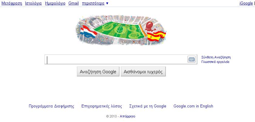MEDIA Που είναι αφιερωμένη σήμερα η σελίδα της Google; Η απάντηση είναι βατή… 11·07·2010 14:15 Μα που αλλού; Φυσικά στον τελικό του Παγκοσμίου Κυπέλλου!