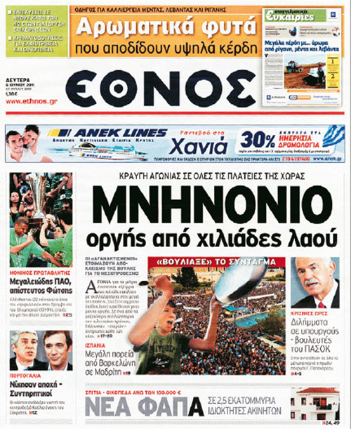Στο «δαίμονα του τυπογραφείου» αποδίδει σε σημερινό του δημοσίευμα το «Έθνος» το λάθος στο χτεσινό πρωτοσέλιδο της εφημερίδας, που αντί για «μ» μπήκε «ν» και το Μνημόνιο έγινε «Μνηνόνιο».