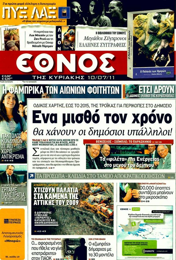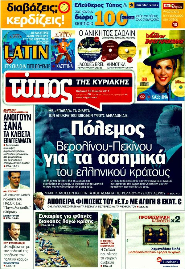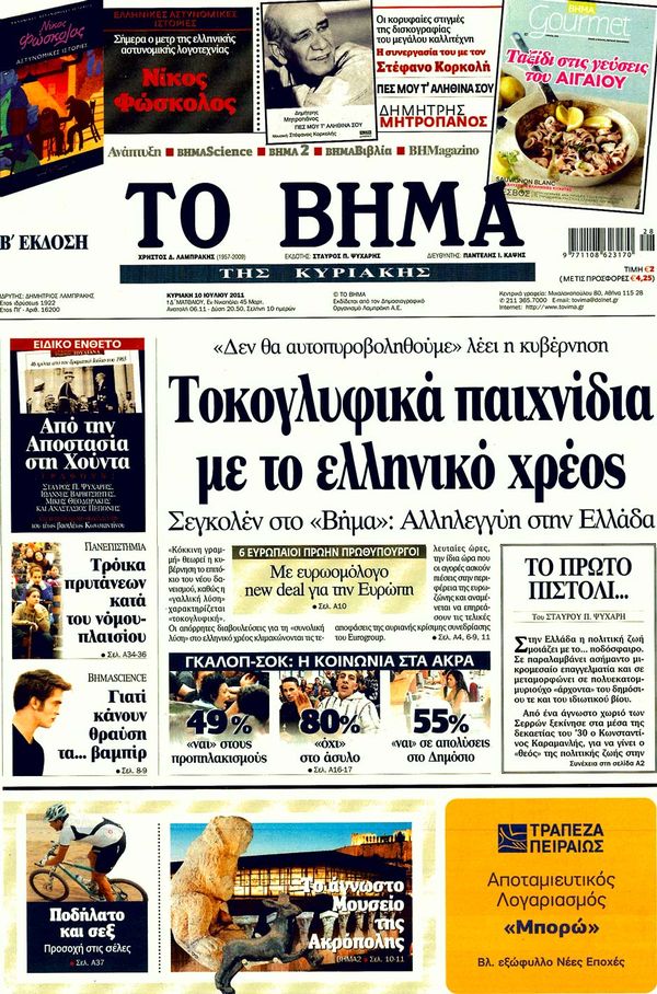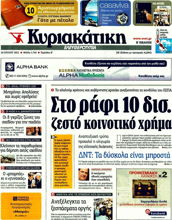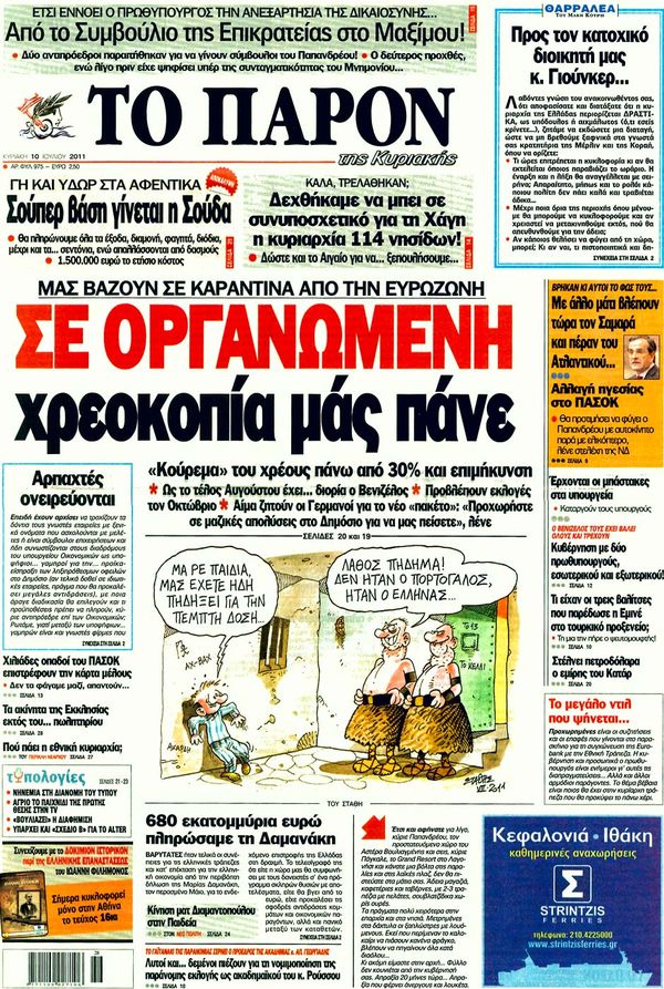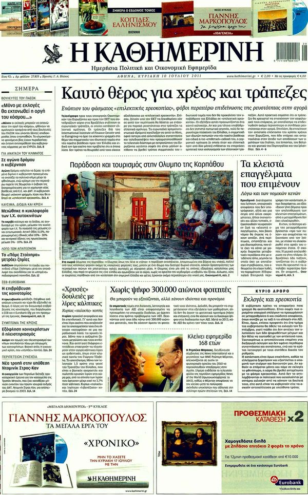 Η ελληνική οικονομία, το χρέος, οι επόμενες δόσεις του δανείου και οι φοροκαταιγίδες που ήρθαν και έρχονται βρίσκονται για μια ακόμη φορά στο επίκεντρο των πρωτοσέλιδων του κυριακάτικου Τύπου.