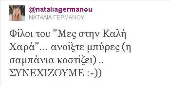 Το επιβεβαίωσε άλλωστε η ίδια μέσω του προσωπικού της λογαριασμού στο twitter, όπου πριν από λίγη ώρα έγραψε: «Φίλοι του “Μες στην Καλή Χαρά”… ανοίξτε μπύρες (η σαμπάνια κοστίζει) .. ΣΥΝΕΧΙΖΟΥΜΕ :-))!».