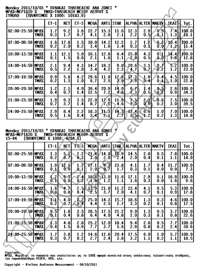 Νικητής στις προτιμήσεις των τηλεθεατών το δελτίο του MEGA με 28,5%. Στη δεύτερη θέση το STAR με 21.2% και ο ANT1 με 17,5%.