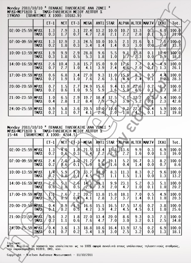 Το δελτίο ειδήσεων του ALTER προτίμησε το κοινό 15-44 με ποσοστό τηλεθέασης 17,6%. Στη δεύτερη και τρίτη θέση MEGA και STAR με 16,6 και 16,5% αντίστοιχα.
