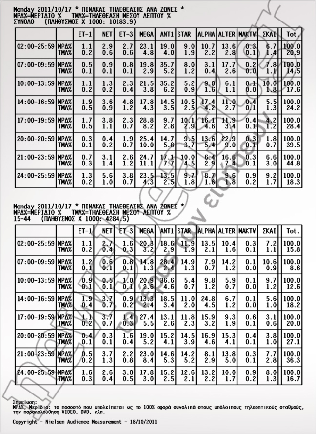 Με 19% τερμάτισε πρώτο το δελτίο του MEGA. Με 0,1% διαφορά τερμάτισε στη δεύτερη θέση το ALTER με 15,3% και ο ANT1 με 15,2%.
