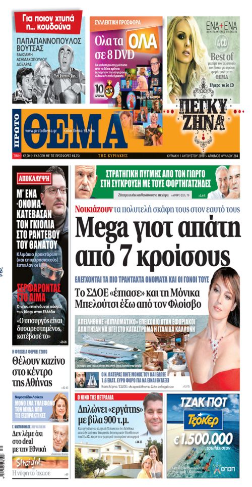 Μην χάσετε αύριο το «Πρώτο θέμα» το οποίο περιλαμβάνει dvd με την αξέχαστη ελληνική κωμωδία με τον Κώστα Βουτσά και το Διονύση Παπαγιαννόπουλο «Για ποιον χτυπά η κουδούνα;», το 2ο cd με τις μεγαλύτερες επιτυχίες της Πέγκυ Ζήνα και το 4ο από τα οχτώ dvd με τα καλύτερα στιγμιότυπα από τα χρόνια εκπομπών της σύγχρονης ελληνικής τηλεόρασης από την εκπομπή «ΟΛΑ».
