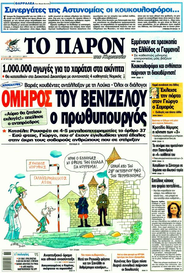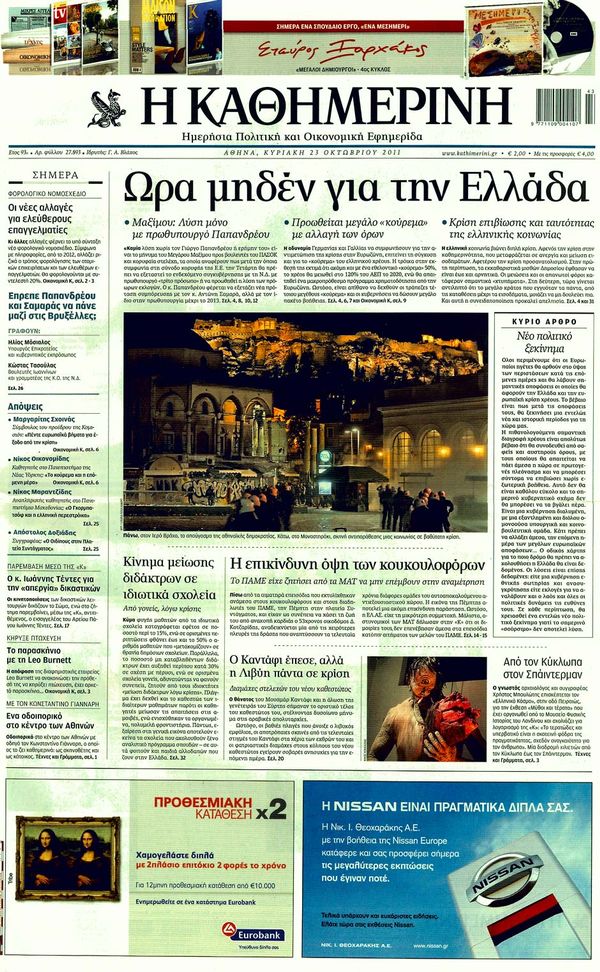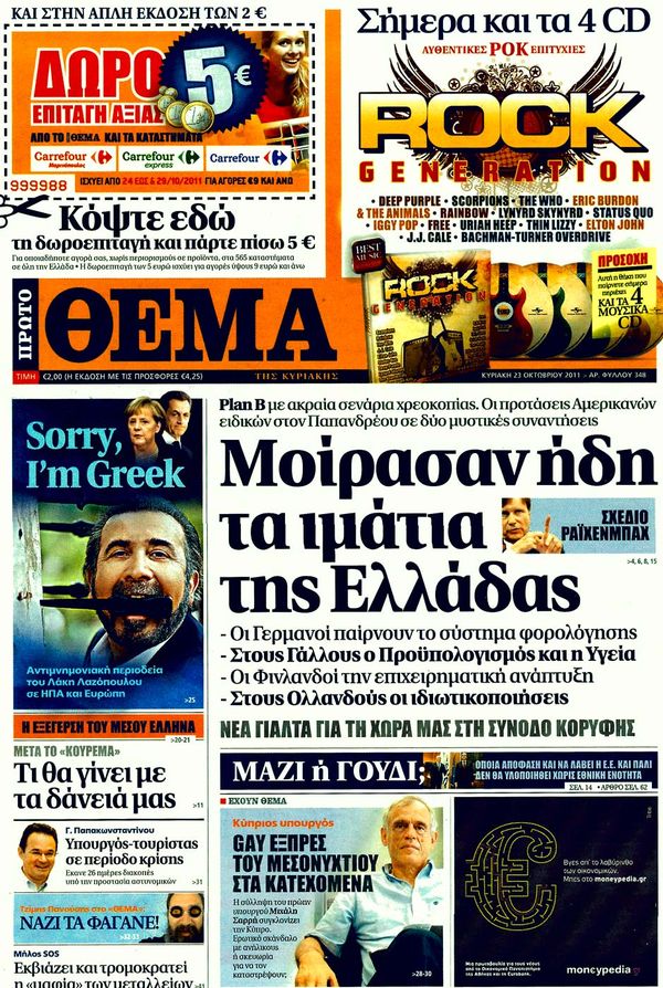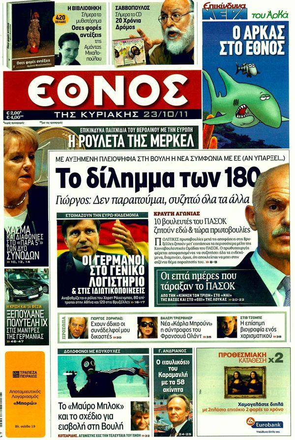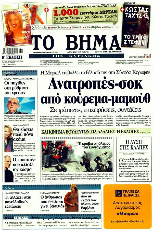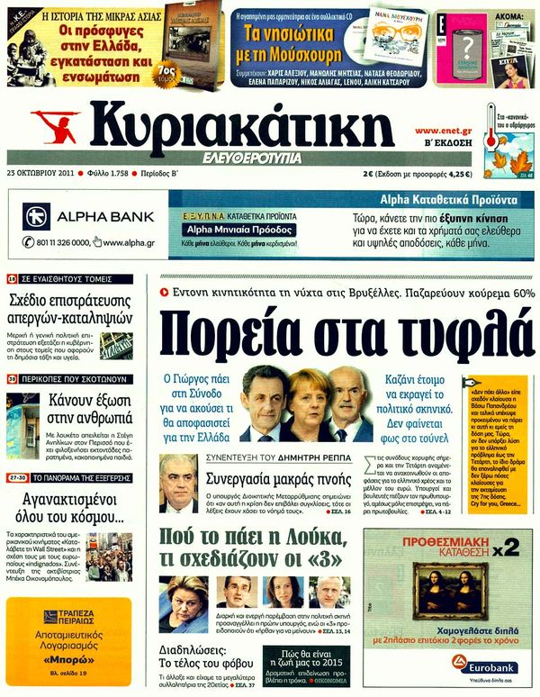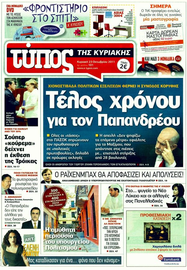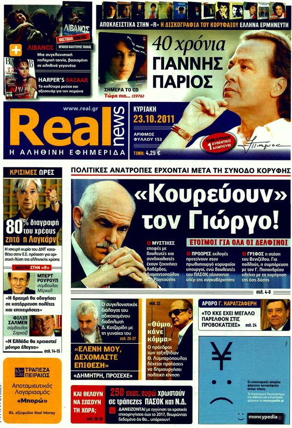 Το κούρεμα και γενικότερα η πορεία του ελληνικού χρέους βρίσκονται στο επίκεντρο των πρωτοσέλιδων των κυριακάτικων εφημερίδων. Από τις εφημερίδες της Κυριακής δεν λείπουν τα δημοσιεύματα για την αυριανή Σύνοδο Κορυφής.