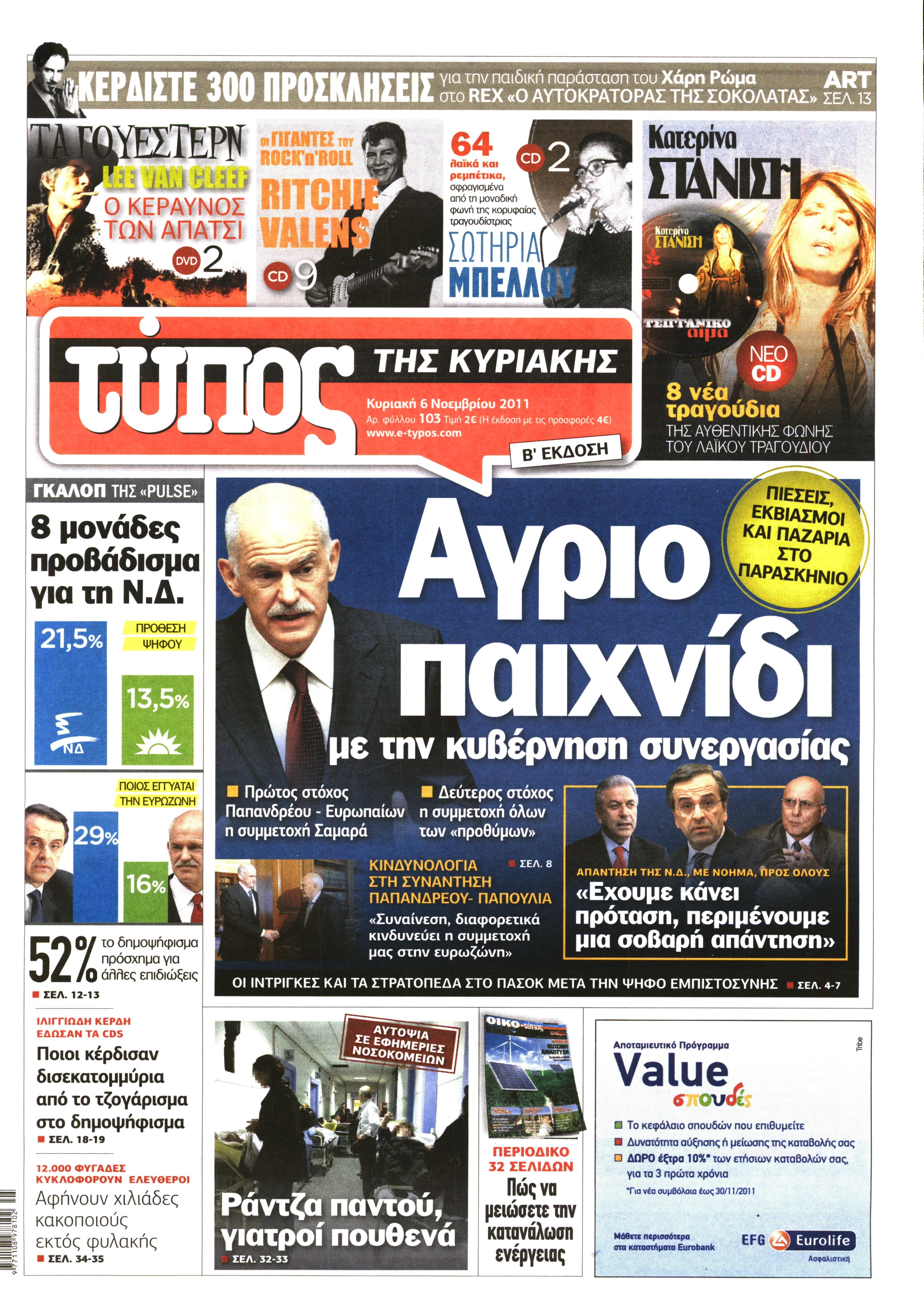 Για επιστροφή στο χάος, κυβέρνηση συναίνεσης Παπανδρέου και Βενιζέλου καθώς και παιχνίδια εξουσίας μεταξύ ευρώ και δραχμής, κάνουν λόγο στα πρωτοσέλιδα τους οι αυριανές Κυριακάτικες εφημερίδες.
