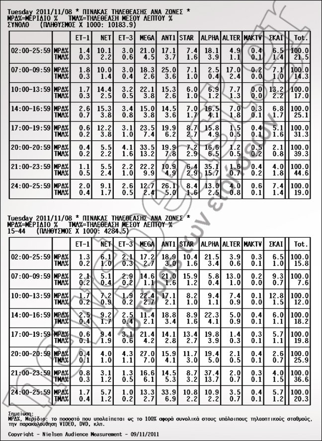 Με 33,5% πήρε την πρωτιά το δελτίο ειδήσεων του MEGA και ακολούθησαν ο ΑΝΤ1 ΜΕ 19,9% και το STAR με 7,2%. Το ALTER δεν μετέδωσε χθες δελτίο λόγω των κινητοποιήσεων των εργαζομένων, που παραμένουν απλήρωτοι.