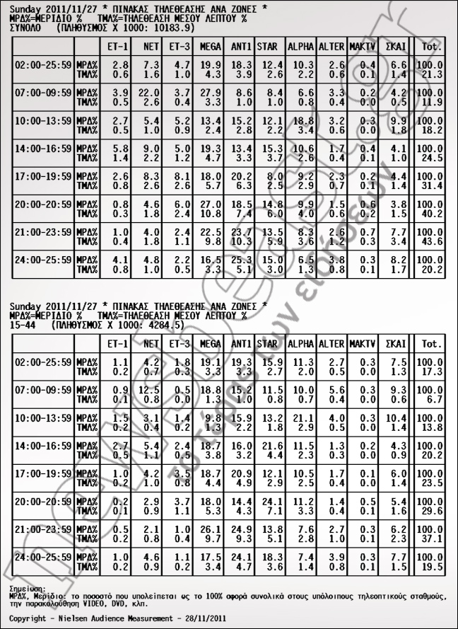 Δείτε πώς διαμορφώθηκε το τηλεοπτικό τοπίο των αγαπημένων σας προγραμμάτων την Κυριακή 27 Νοεμβρίου 2011: