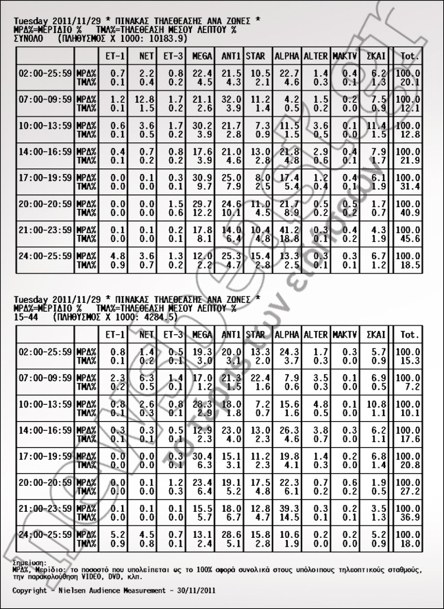 Με 29,7% βγήκε πρώτο το δελτίο του MEGA. Στη δεύτερη θέση ο ΑΝΤ1 με 24,6% και το STAR με 11%.