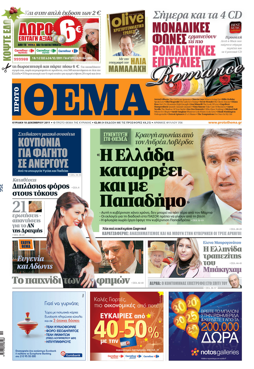 Μη χάσετε αύριο το «Πρώτο θέμα» με τη δωροεπιταγή αξίας έξι ευρώ από τα καταστήματα Carrefour. Μαζί, 4 CD με ρομαντικές επιτυχίες καθώς και το περιοδικό «olive» με προτάσεις για το χριστουγεννιάτικο σας τραπέζι, με την υπογραφή του Ηλία Μαμαλάκη.