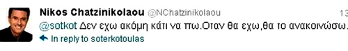 Μέσα από το λογαριασμό του στο twitter, έδωσε λοιπόν μια λιτή και όχι τόσο ξεκάθαρη απάντηση: «Όταν έχω κάτι να πω, θα το πω. Δεν έχω κάτι ακόμα να πω.»
