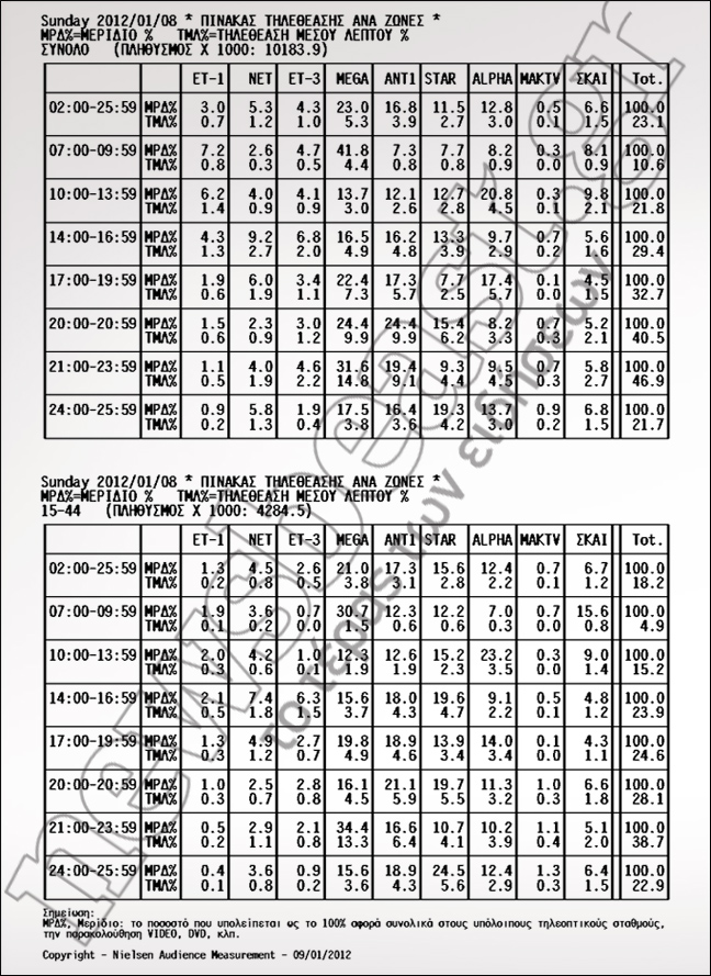 Το βάθρο του νικητή μοιράστηκαν χθες τα δελτία ειδήσεων του Mega και του ΑΝΤ1 συγκεντρώνοντας ποσοστό 24,4%. Ακολούθησε στην κατάταξη το STAR με 15,4%.