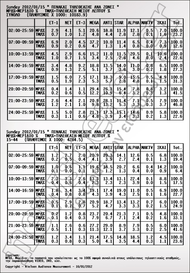 Πρωτιά για το δελτίο ειδήσεων του Mega με 29,4%. Στη δεύτερη θέση ΑΝΤ1 με 26,3% και STAR με 15,4%