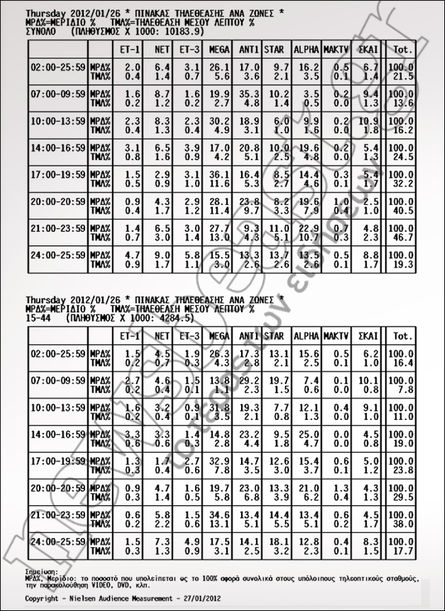 Πρώτο τερμάτισε το δελτίο του ΑΝΤ1 με 23%, στη δεύτερη θέση το Mega με 19,7% και στην τρίτη το STAR με 13,3%.