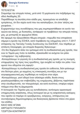 Με ανακοίνωσή τους μέσω Facebook, δύο δημοσιογράφοι που πραγματοποιούσαν απεργία πείνας επί δύο σχεδόν εβδομάδες, έξω από την ΕΣΗΕΑ, η Αφροδίτη Υψηλάντη και η Τζώρτζια Κοντράρου, γνωστοποίησαν πως σταματούν την απεργία.