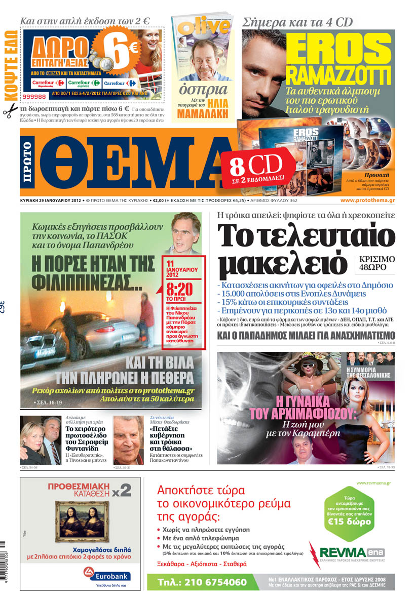 Μη χάσετε αύριο το «Πρώτο θέμα» με τα τέσσερα CD του πιο ερωτικού Ιταλού τραγουδιστή, Eros Ramazzotti. Μαζί, η δωροεπιταγή αξίας 6 ευρώ από τα καταστήματα Carrefour και το περιοδικό «Olive» με την υπογραφή του Ηλία Μαμαλάκη.