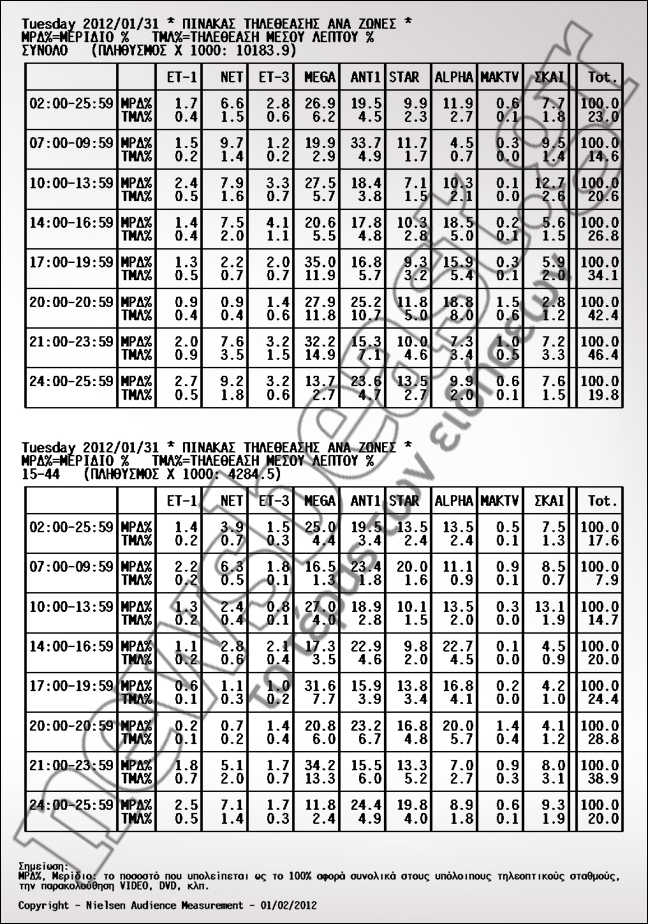 Νικητής βγήκε χθες το Mega και το δελτίο ειδήσεών του με 27,9%. Στη δεύτερη θέση ο ΑΝΤ1 με 25,2% και στην τρίτη το STAR με 11,8%.