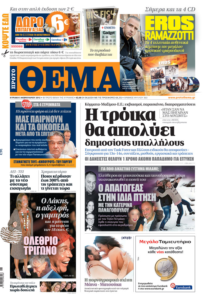 Μη χάσετε αύριο το «Πρώτο θέμα» με τα τέσσερα τελευταία CD του μεγάλου ερωτικού τραγουδιστή Eros Ramazzotti. Μαζί, μια δωροεπιταγή αξίας 6 ευρώ από τα καταστήματα Carrefour καθώς και το περιοδικό Big Fish.
