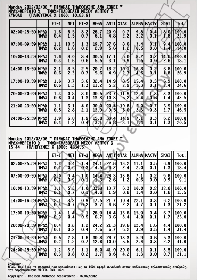 Με 30,5% τερμάτισε πρώτο το δελτίο του Mega. Ακολούθησαν ΑΝΤ1 με 23,7% και STAR με 11,9%.