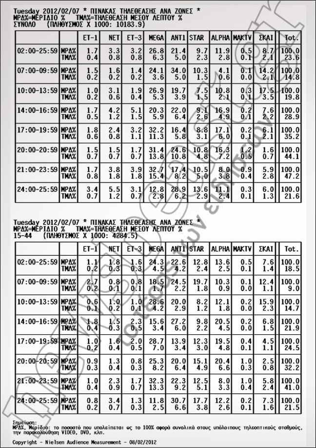 Πρωτιά με 25,3% για το Mega. Ακολούθησαν ΑΝΤ1 με 20% και STAR με 15,1%.