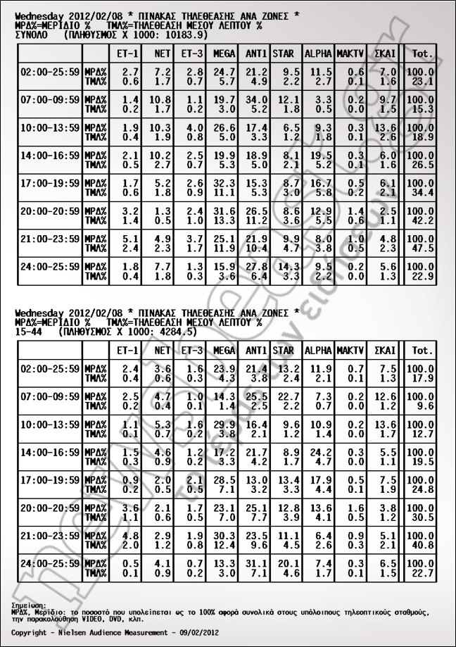 Με 25,1% βγήκε νικητής το βραδινό δελτίο του ΑΝΤ1. Στη δεύτερη θέση Mega με 23,1% και STAR με 12,8%.