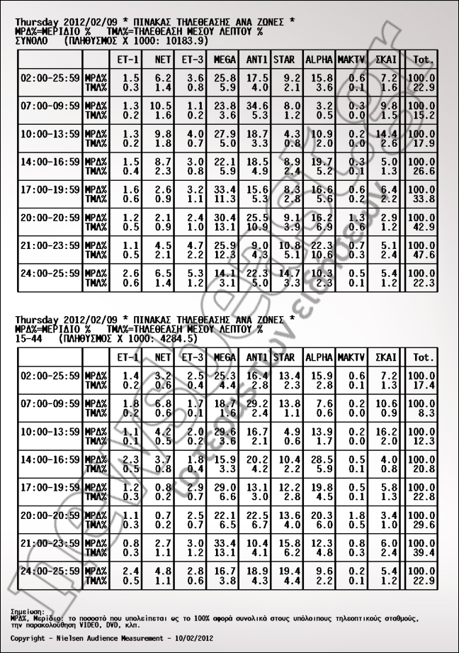 Στην πρώτη θέση το Mega με 30,4%, στη δεύτερη ΑΝΤ1 με 25,5% και στην τρίτη το STAR με 9,1%.