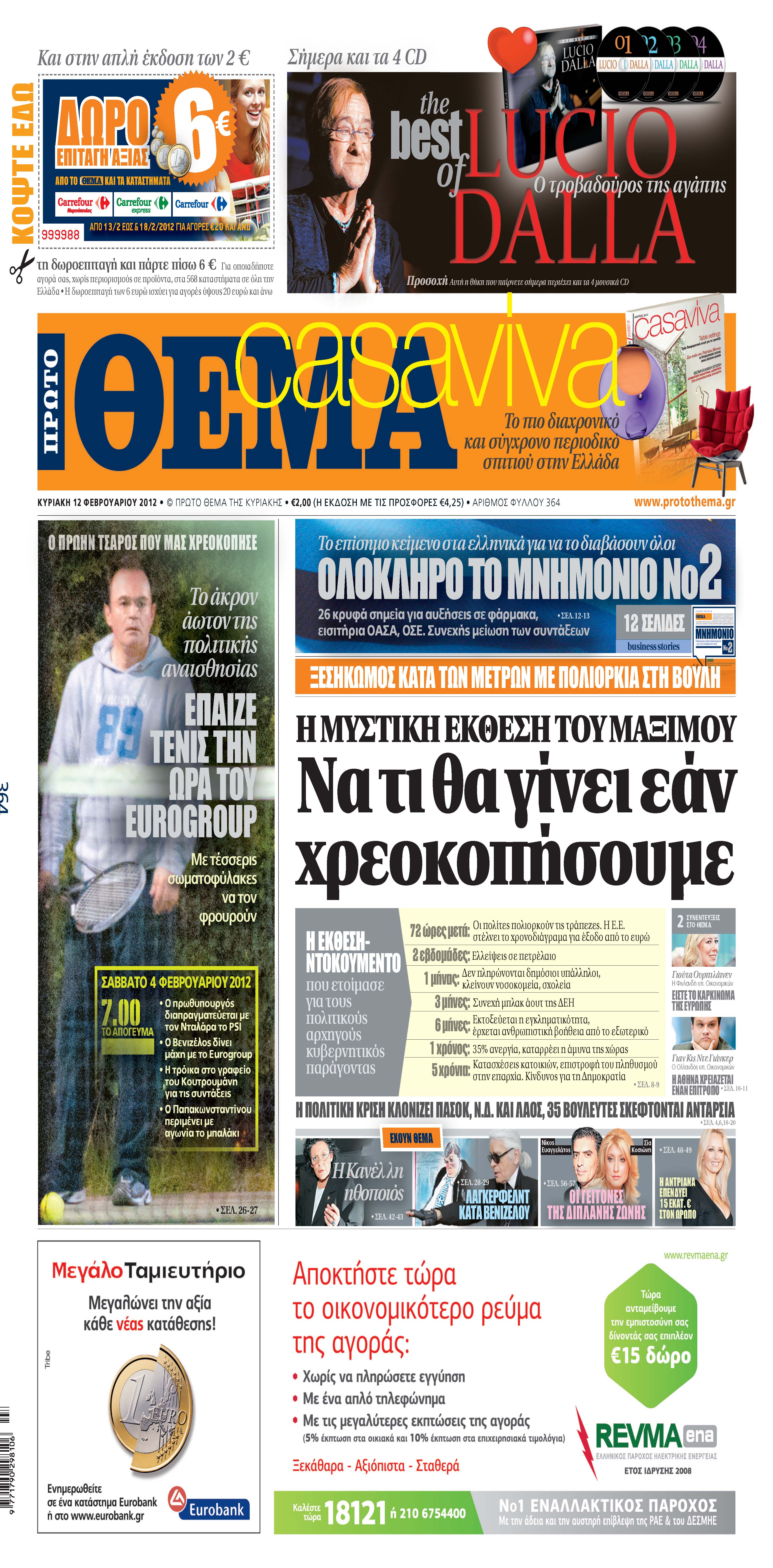 Μη χάσετε αύριο το «Πρώτο θέμα» με τη δωροεπιταγή αξίας έξι ευρώ από τα καταστήματα Carrefour. Μαζί τέσσερα CD με τραγούδια του Lucio Dalla, καθώς και το περιοδικό casa viva με ιδέες και προτάσεις για τη διακόσμηση του σπιτιού σας.