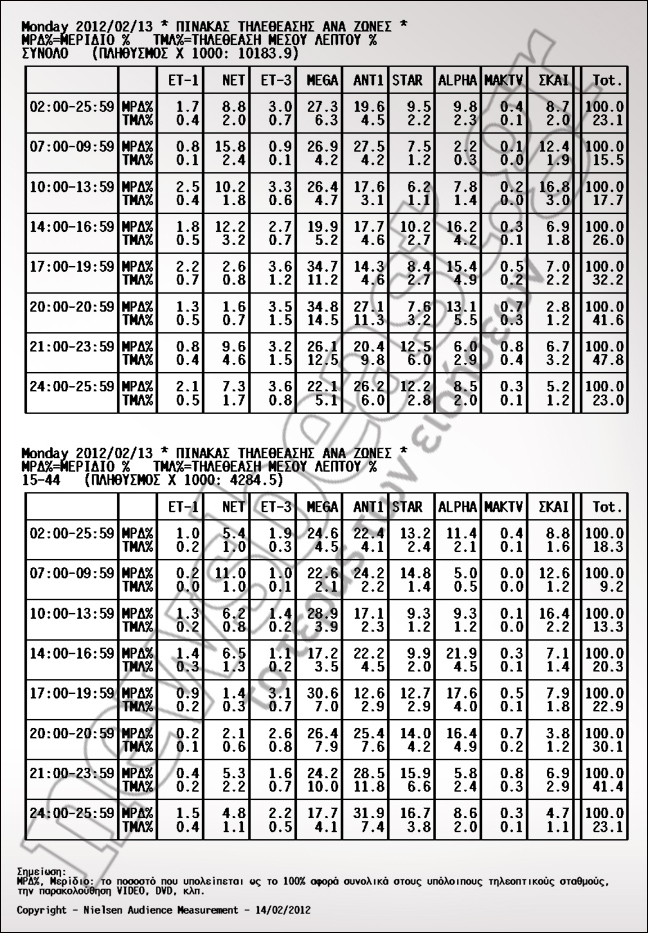 Στην πρώτη θέση το Mega με 26,4%. Ο ΑΝΤ1 τερμάτισε με 25,4% και το STAR με 14%.