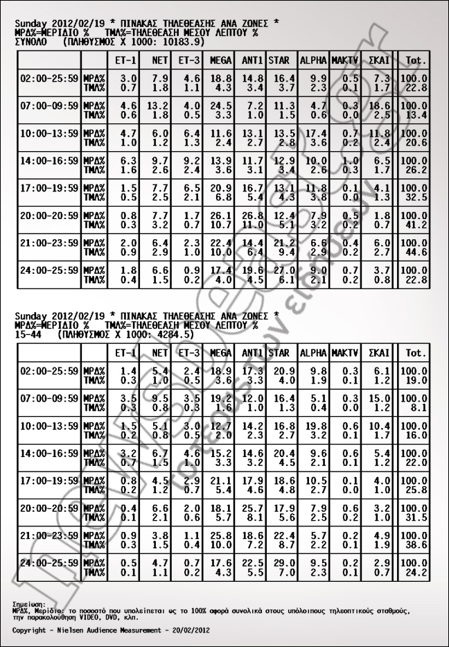 Νικητής στην «κούρσα» της τηλεθέασης ήρθε το δελτίο του ΑΝΤ1 με 25,7%. Ακολούθησαν Mega με 18,1% και STAR με 17,9%.
