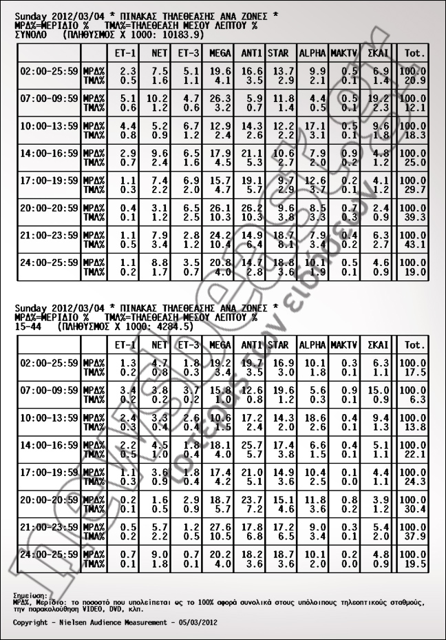 Πρωτιά για το δελτίο του ΑΝΤ1 με 26,2%. Ακολούθησαν Mega με 26,1% και STAR με 9,6%.