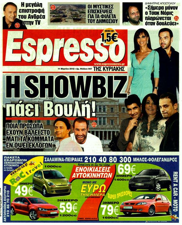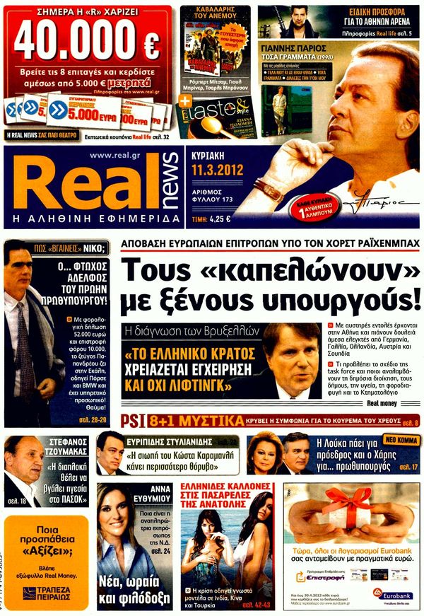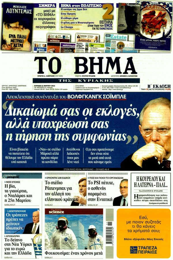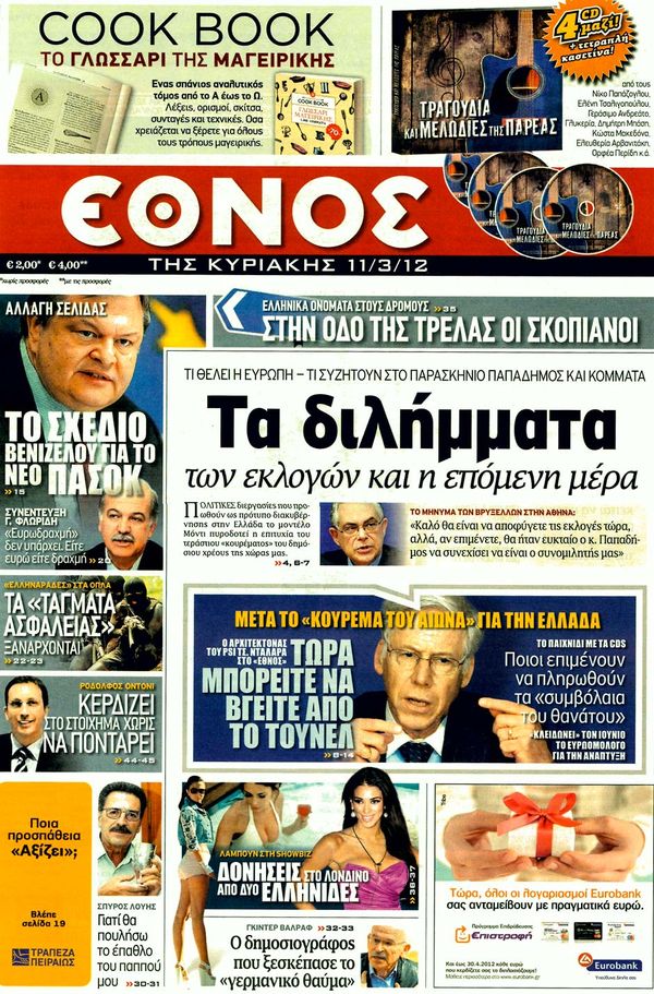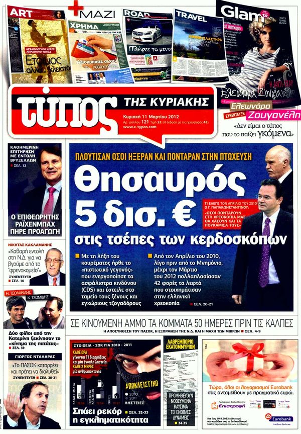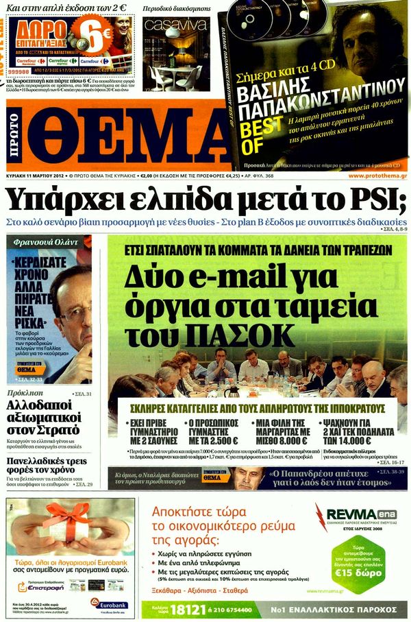 Για τα διλήμματα των εκλογών, για θησαυρό 5 δισ. ευρώ στις τσέπες των κερδοσκόπων και για δύο e-mail για όργια στα ταμεία του ΠΑΣΟΚ κάνουν λόγο στα πρωτοσέλιδα τους οι αυριανές κυριακάτικες εφημερίδες.