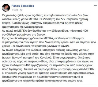 Στις τελευταίες εξελίξεις στο Mega αναφέρεται σε ανάρτησή του στο Facebook ο Πάνος Σόμπολος. Όπως σημειώνει, μεταξύ άλλων, «εμείς που δουλέψαμε χρόνια στο ΜΕΓΚΑ, αισθανόμαστε θλίψη και συμπαριστάμεθα στον αγώνα που δίνουν καθημερινά – εδώ και περίπου δύο χρόνια – οι συνάδελφοι, να κρατηθεί ζωντανό το κανάλι».