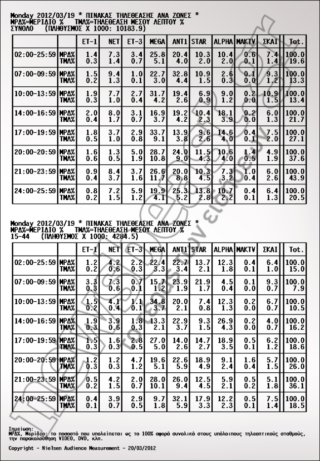 Στην πρώτη θέση της τηλεθέασης το δελτίο του Mega με 28,7%. Ακολούθησαν ΑΝΤ1 με 24% και STAR με 11,5%.