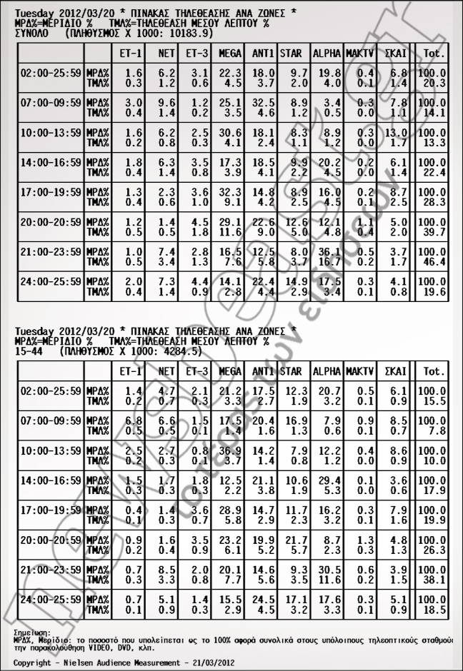 Πρωτιά για το δελτίο του Mega με 23,2%. Στη δεύτερη θέση το STAR με 21,7% και στην τρίτη ο ΑΝΤ1 με 19,9%.