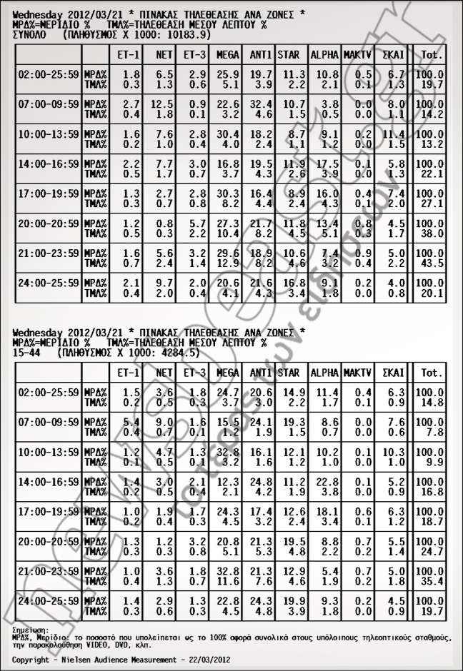 Νικητής στις προτιμήσεις των τηλεθεατών βγήκε το δελτίο του ANT1 με 21,3%. Ακολούθησαν Mega με 20,8% και το STAR με 19,5%.
