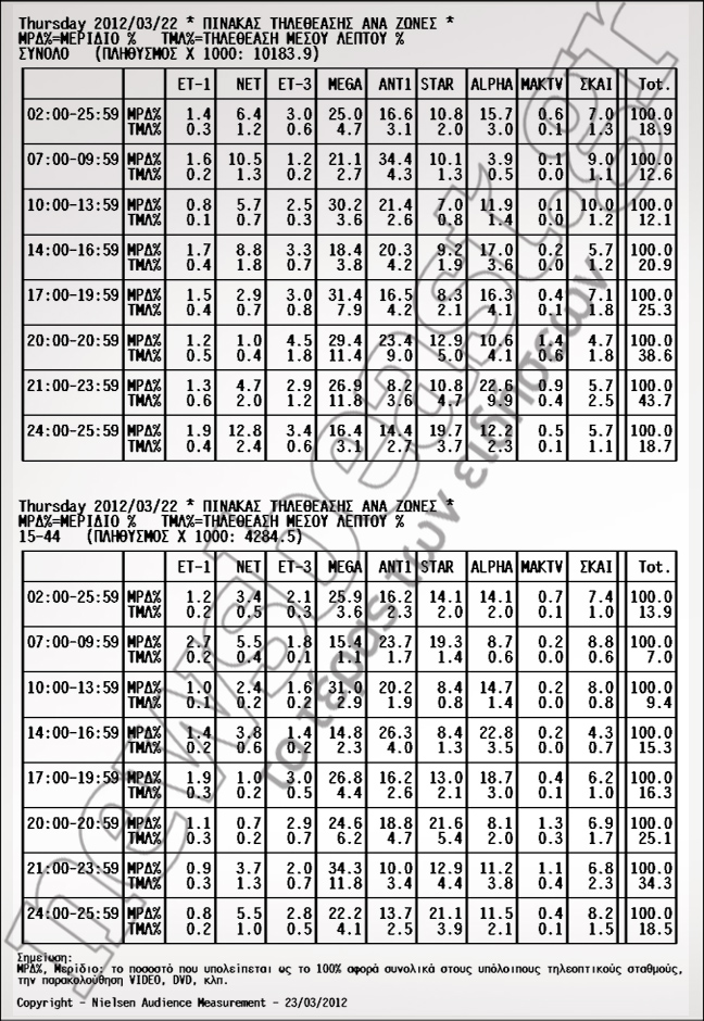 Νικητής το Mega με 24,6%. Ακολούθησαν STAR με 21,6% και ΑΝΤ1 με 18,8%.