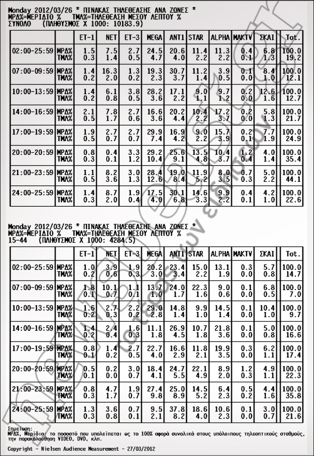 Στην πρώτη θέση της προτίμησης των τηλεθεατών το δελτίο του Mega με 29,2%. Στη δεύτερη θέση ο ΑΝΤ1 με 25,6% και το STAR με 13,5%.