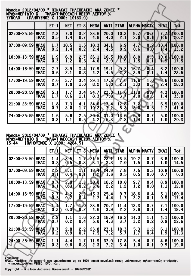 Πρωτιά για Mega με 22,3%. Ακολούθησαν ΑΝΤ1 με 18,9% και STAR με 16,2%.