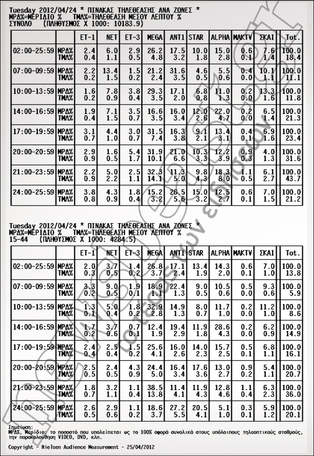 Νικητής στην «κούρσα» της τηλεθέασης το Mega με 24,4%. Στη δεύτερη θέση το STAR με 17,6% και στην τρίτη o ANT1 με 16,4%.