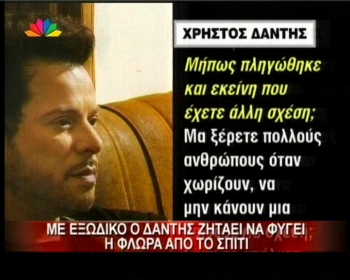 Πολύ γνωστός Έλληνας τραγουδιστής ζητά με εξώδικο να αποχωρήσει από την μέχρι πρότινος κοινή τους κατοικία η σύζυγός του. Πρόκειται για τον Χρήστο Δάντη, οποίος ζήτησε από τη Φλώρα Θεοδώρου να φύγει από το σπίτι, που μέχρι πριν από ένα χρόνο στέγαζε τον έρωτά τους. Ο τραγουδιστής ισχυρίζεται ότι το σπίτι του ανήκει και παρ’ όλα αυτά αναγκάζεται να ζει σε ενοίκιο ενώ συμπλήρωσε, ότι μόλις βγει το διαζύγιό του σκέφτεται πολύ σοβαρά να ξαναπαντρευτεί και να γίνει πατέρας για άλλη μια φορά!