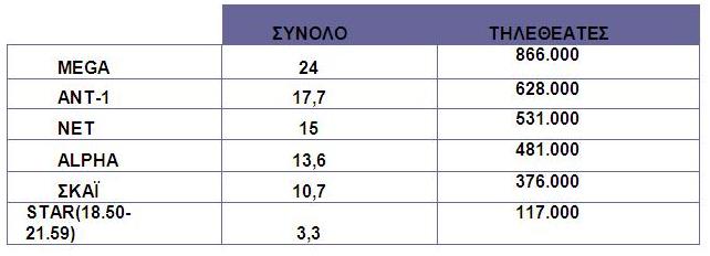 Την ίδια ώρα την εκπομπή του ΑΝΤ1 παρακολούθησαν 628.000 τηλεθεατές (ποσοστό 17,7%), της ΝΕΤ 531.000 τηλεθεατές (ποσοστό 15%), του ALPHA 481.000 τηλεθεατές (ποσοστό 13,6%), του ΣΚΑΪ 376.000 τηλεθεατές (ποσοστό 10,7%) και του STAR 117.000 τηλεθεατές (ποσοστό 3,3%).