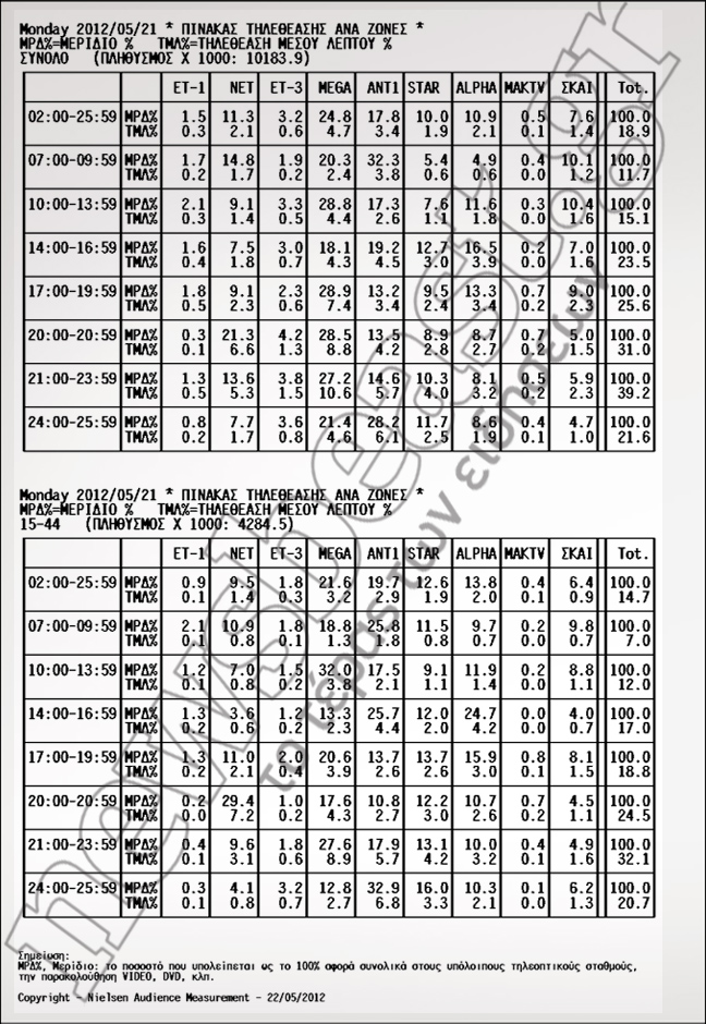 Πρωτιά για το δελτίο του Mega με 28,5%. Ακολούθησαν ΑΝΤ1 με 13,5% και STAR με 8,9%