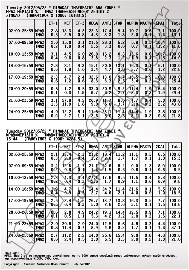 Πρωτιά Mega με 33%. Στη δεύτερη θέση της τηλεθέασης ο ΑΝΤ1 με 20,9% και στην τρίτη το STAR με 9,2%.